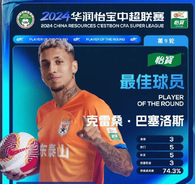 5月3日威尼斯人电子游戏,中超官方公布,第9轮最好球员为山东泰山球员克雷桑-巴塞洛斯。